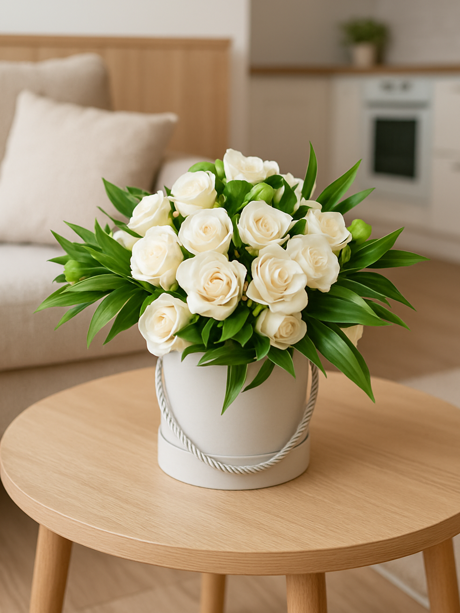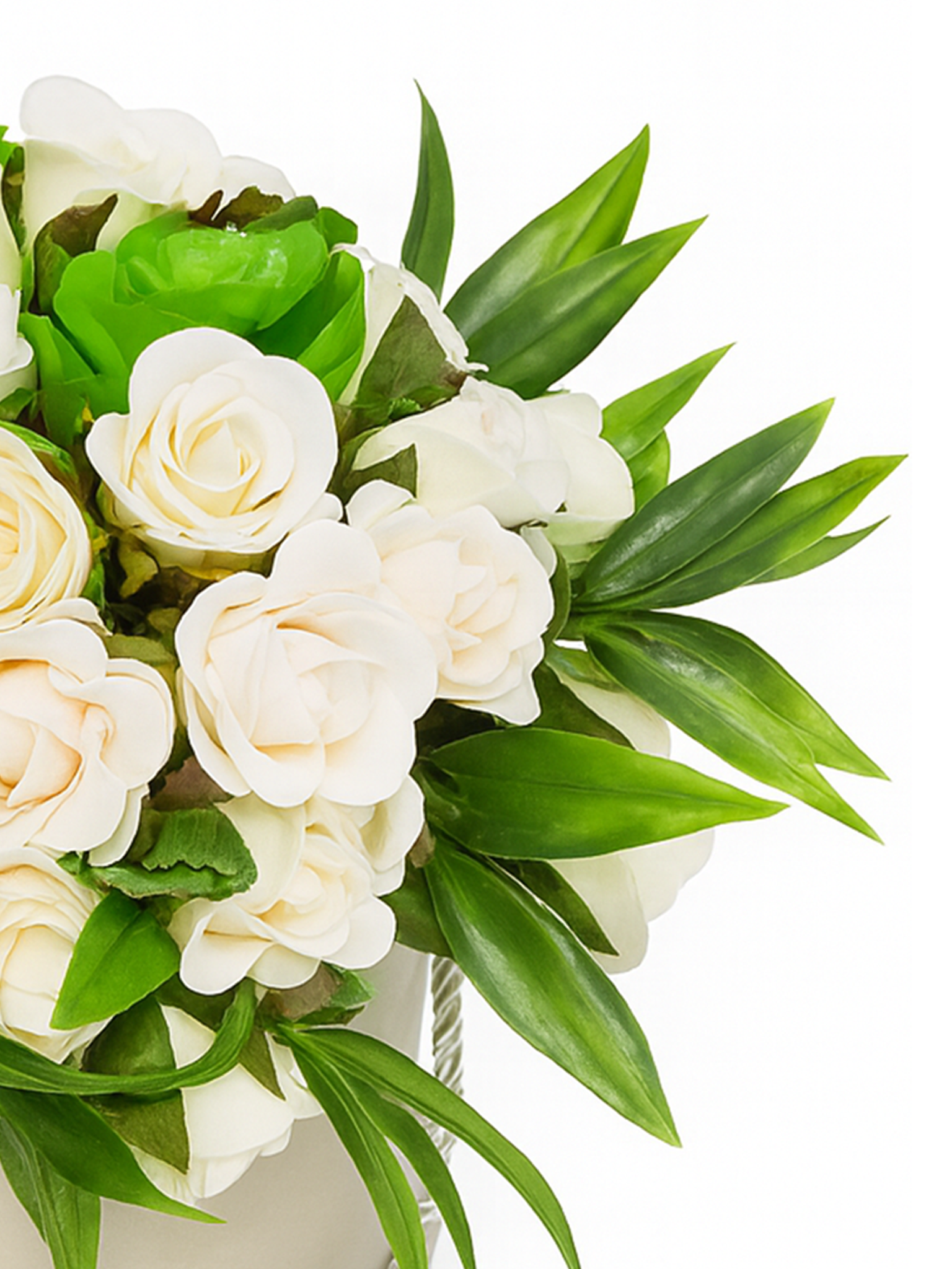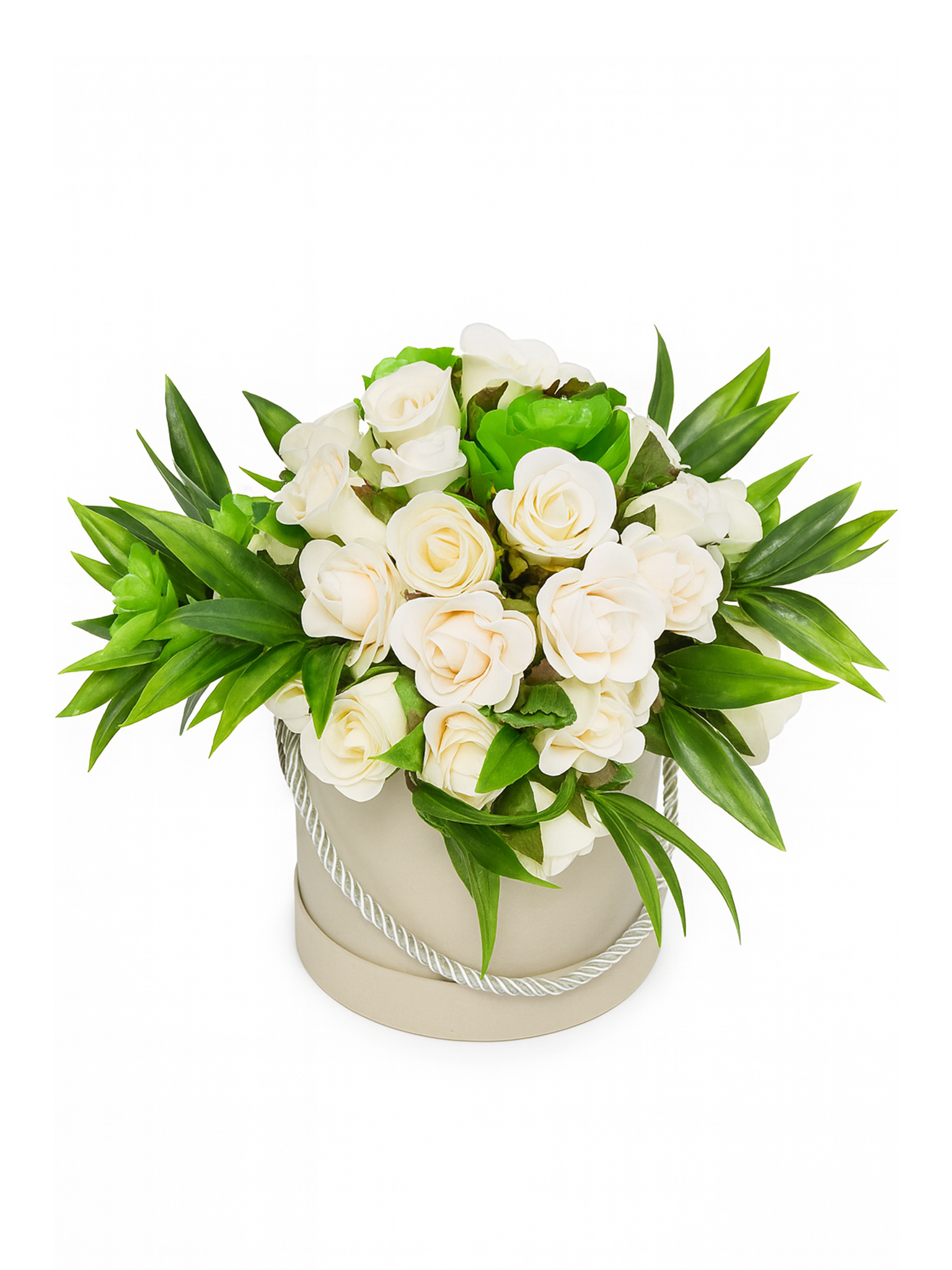 Każdy bukiet powstaje w całości ręcznie, dzięki czemu każdy egzemplarz ma swój wyjątkowy, niepowtarzalny charakter. Kremowe róże o miękkim wykończeniu przeplatają się z soczyście zielonymi liśćmi, tworząc spójną i pełną lekkości kompozycję. Całość została umieszczona w eleganckim pojemniku, który dodaje dekoracji wytwornego wyglądu i sprawia, że jest gotowa do ekspozycji zaraz po wyjęciu z pudełka – na stole, komodzie, konsoli czy parapecie.